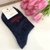 Chaussettes à paillettes bleu marine avec inscription « Bisou ♡ » rouge.